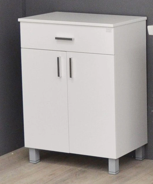 Vertikalni elementi na nogicama. Klasičan izgled koji se uklapa u svaku kupaonicu. Ugrađeni usporivači zatvaranja. Korpus izrađen od iverice, fronte od lakiranog MDF-a Različite kombinacije ormara i ladica.